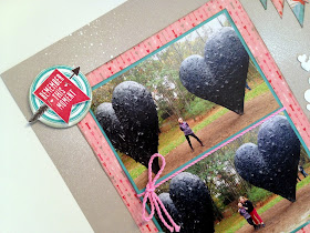 For the first page, I started out by spraying white ink randomly on the paper. While that was drying, I cut out 2 heart overlays from the CTMH Artbooking Cricut cartridge. I cut the first one in half and placed it behind the photo making it looking it was floating off the page.